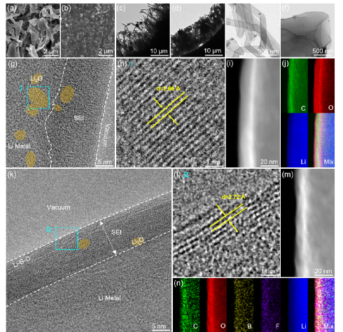 在本研究中,一種先進的電解質使用三種鹽溶解在碳酸鹽溶劑的組合被開發。鹽陰離子主導原生溶劑化鞘層,導致Li+與溶劑之間的弱相互作用,并在原位形成富無機雙層固體電解質界面(SEI)。在所設計的電解質中,具有高負載NMC陰極(約20 mg cm- 2)的LMB具有高循環穩定性,在4.5 V的截止電壓下,200次循環后的容量保持率為89.89%。低溫透射電鏡表征(Cryo-TEM)和密度泛函理論(DFT)計算表明,硼酸鹽基雙層SEI具有異常致密的結構,有效地抑制了鋰枝晶的生長,并證明了無機成分的連續性和致密性在SEI中起著至關重要的作用,其重要性超過了吸收和遷移能壘。這種對SEI結構的深刻理解對于推進高穩定LMB的發展具有巨大的潛力,并且可以擴展到其他電池系統。