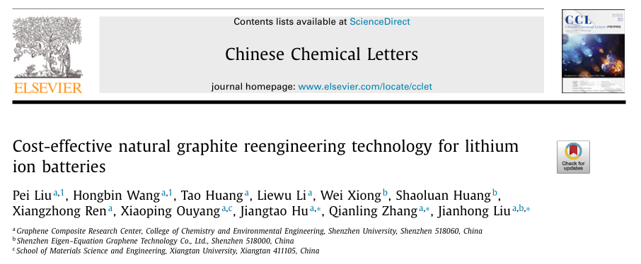 6. 深圳大學化學與環境工程學院張黔玲教授團隊在材料領域頂尖期刊Chinese Chemical Letters(影響因子6.78,中科院JCR1區)發表了題為“Cost-effective natural graphite reengineering technology for lithium ion batteries”的研究論文。該團隊碩士研究生劉珮和黃濤為論文共同第一作者,胡江濤、張黔玲、劉劍洪為該論文通訊作者。