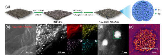 該工作以石墨烯為導電基底負載低載量鉑納米顆粒,并采用異質原子摻雜和缺陷工程策略,在鉑顆粒上進行鎳摻雜并且同時構建原子尺度缺陷,在鉑顆粒上同時引入配體效應與應變效應。實驗結果表明,配體效應提升了鉑顆粒的ORR催化活性,應變效應有效提高了催化劑的及一氧化碳和甲醇的耐受性能。
