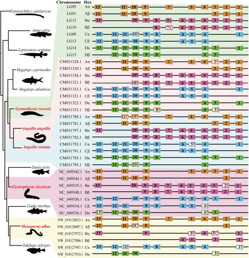 Hox和tbx兩個基因家族與魚類鰭條發育密切相關。分析發現,海水鰻(無胸鰭)基因組中某些Hox基因(如HoxB9β和HoxD13)發生丟失,并且特定tbx基因(tbx5)出現變異(圖3),這些可能是鰻鱺目魚類胸鰭退化的關鍵因素。