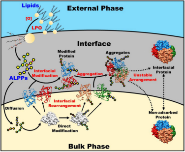 界面廣泛存在于生物體和各類食品中,各類界面(如液-液界面、氣-液界面等)的存在對生命活動的正常進行或食品品質的穩定維持具有重要意義。無論對于生物體還是食品,蛋白質不僅作為物質基礎直接參與界面的組成,也可通過向界面的擴散、吸附以及重排等一系列界面行為來行使其穩定界面的功能。另一方面,脂質過氧化(LPO)是生命活動和食品加工中最常見也備受關注的生化進程。在活性氧的作用下,脂質中的多不飽和脂肪酸可逐漸裂解形成各種脂質衍生親電體(LDEs),這些LDEs可對蛋白質中的親核殘基,如賴氨酸、半胱氨酸和組氨酸進行共價修飾,從而造成蛋白功能紊亂或食品品質下降。值得注意的是,在水-油界面體系中,LPO同樣被視為一種界面現象,因此作者們推測界面可能為LDEs對蛋白質的修飾作用提供獨特的微環境,從而引起蛋白界面行為的改變。