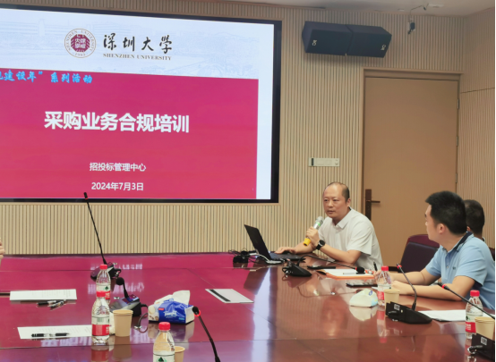 根據(jù)學(xué)院合規(guī)建設(shè)工作安排,結(jié)合學(xué)校相關(guān)工作要求,7月3日下午,學(xué)院邀請(qǐng)深圳大學(xué)招投標(biāo)中心開(kāi)展“合規(guī)建設(shè)年系列-招標(biāo)采購(gòu)業(yè)務(wù)合規(guī)建設(shè)培訓(xùn)”活動(dòng)。深圳大學(xué)招投標(biāo)管理中心主任黃雪峰、副主任陳錚及謝武、劉靚鈺兩位老師,計(jì)算機(jī)與軟件學(xué)院黨委書(shū)記楊國(guó)洪、副院長(zhǎng)賈森及學(xué)院全體行政管理實(shí)驗(yàn)技術(shù)人員參加本次培訓(xùn)活動(dòng),楊國(guó)洪主持會(huì)議。